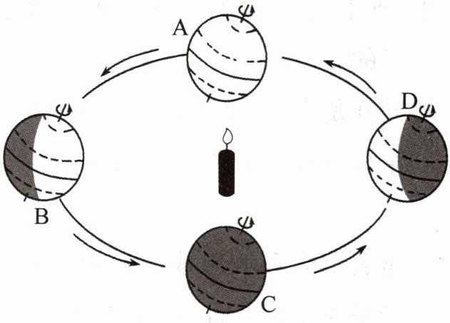 2. 在研究地球的公转与四季变化的模拟实验中,请观察下图,结合所学知识回答下面的问题。