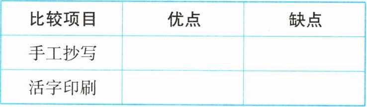 3. 比较手工抄写与活字印刷的优缺点,完成下列表格。