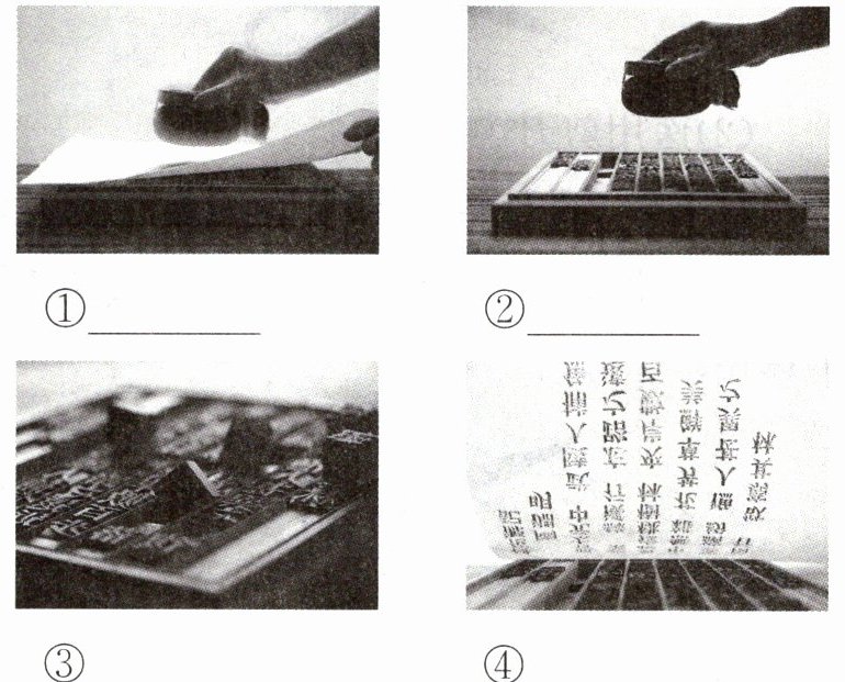 2. 你了解活字印刷的步骤吗?请观察下面图片,图片分别展现的是活字印刷的哪个步骤?请你填写在横线上,并把图片按照活字印刷的正确步骤排排顺序。