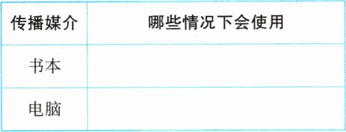 1. 书本和电脑都是传播信息的工具。请思索一下,在哪些情况下会从书本中获得信息,哪些情况下会借助电脑获取信息呢?填在下面表格中。