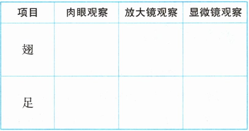 1. 用肉眼、放大镜和显微镜分别观察蝴蝶的翅和足,将观察到的图像画在表格里。