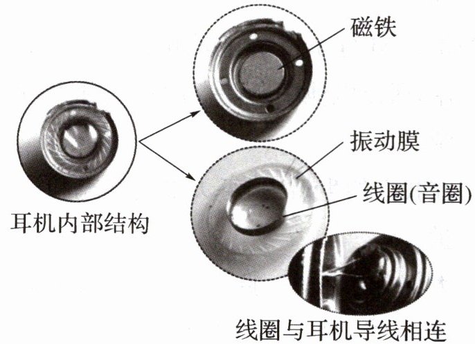 探究问题:“电可以转换成磁”,这在我们生活中有着非常广泛的应用。比如,我们听音乐使用的耳机,就是应用这个原理发出声音的。将废旧耳机拆开,观察里面的结构,分析一下耳机是如何发出声音的。(若没有可拆解的耳机设备,则可以借鉴图中耳机的结构进行分析)