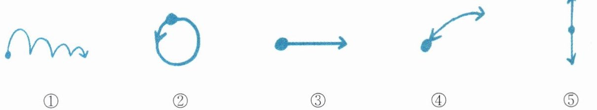 旋转的指尖陀螺( ),工作的汽车雨刮器( ),拨动的古筝琴弦( ),行驶的汽车车身( ),向前弹跳的弹力球( )。