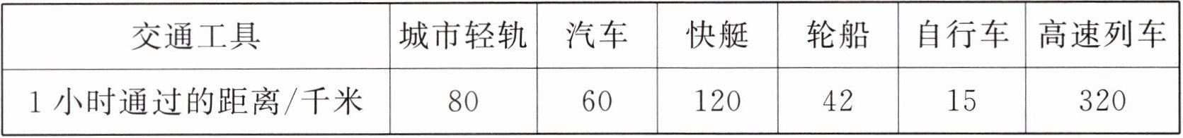 6 种交通工具 1 小时内通过的距离如下表所示: