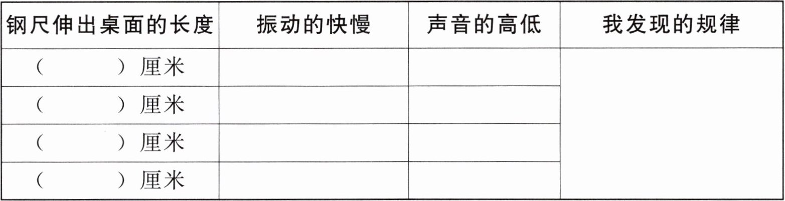 (5)厘米| 快| 高| 钢尺伸出桌面越短,振动越快,声音越高;钢尺伸出桌面越长,振动越慢,声音越低。|
