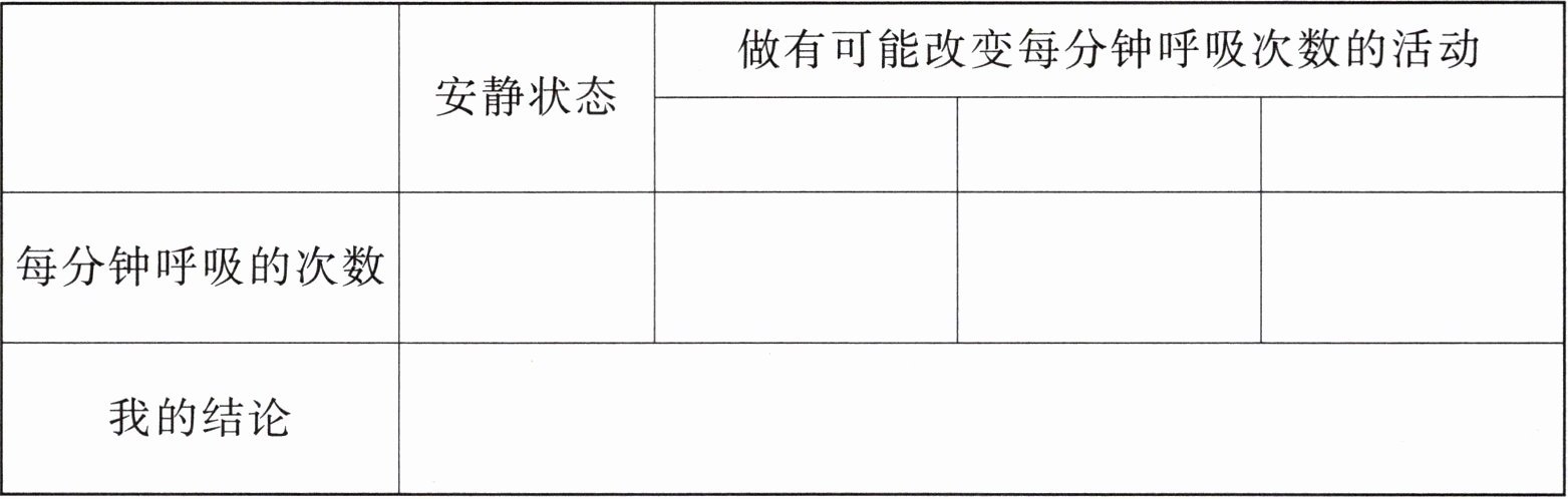 | 我的结论 | 人体在进行活动时,每分钟呼吸次数会增加。 |