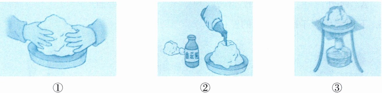 模拟火山喷发的实验步骤有:①加热“小山”,直到“火山”喷发;②用一些土豆泥堆出一座“小山”;③从“山顶”往下挖出一个深坑,加番茄酱后,再用一点土豆泥封住洞口。