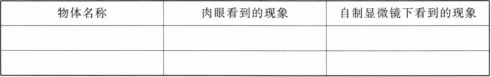 |物体名称|肉眼看到的现象|自制显微镜下看到的现象|