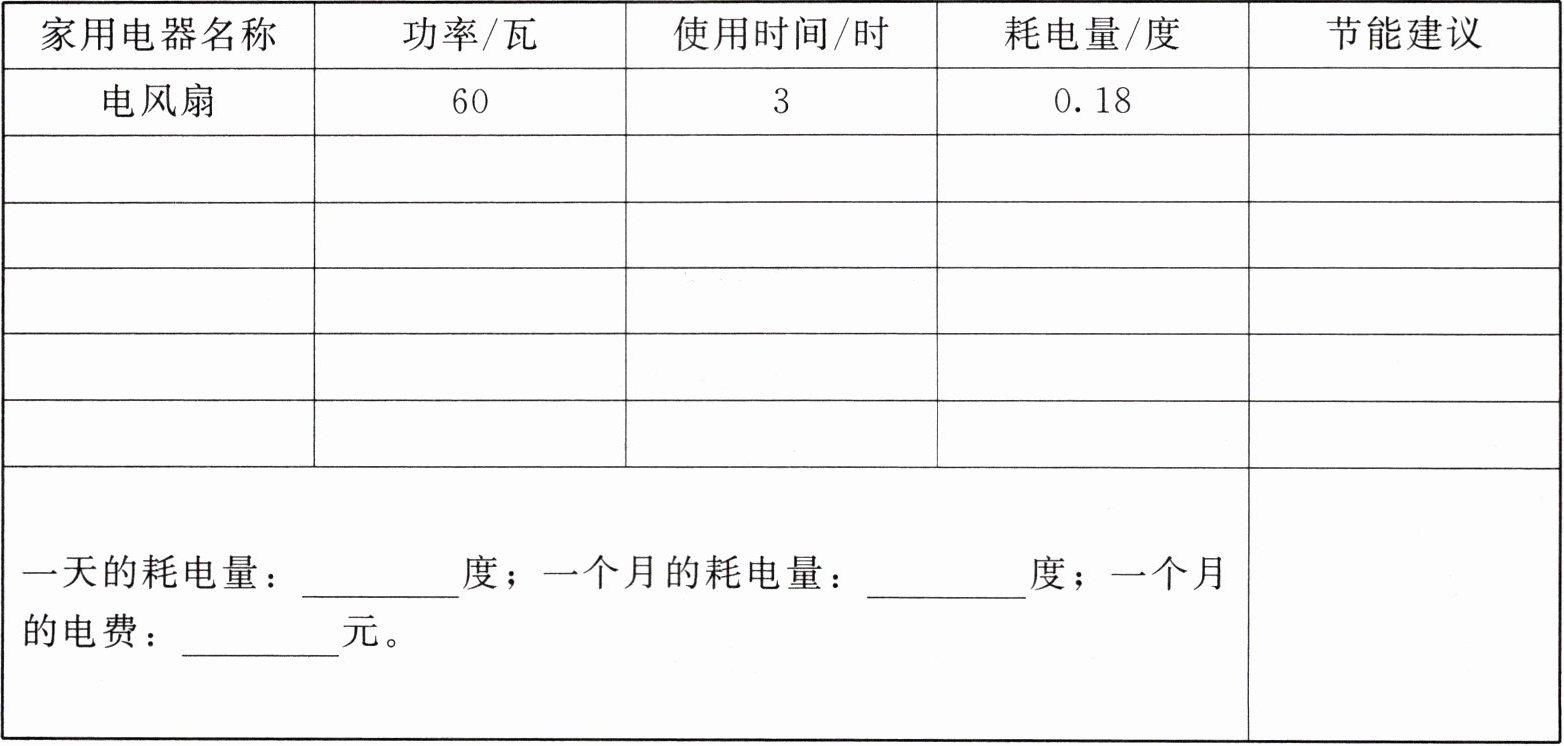 |家用电器名称|功率/瓦|使用时间/时|耗电量/度|节能建议|
