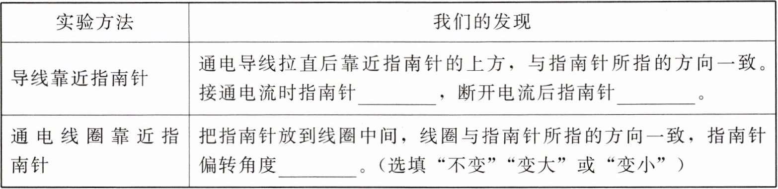 |通电线圈靠近指南针|把指南针放到线圈中间,线圈与指南针所指的方向一致,指南针偏转角度______。(选填“不变”“变大”或“变小”)|