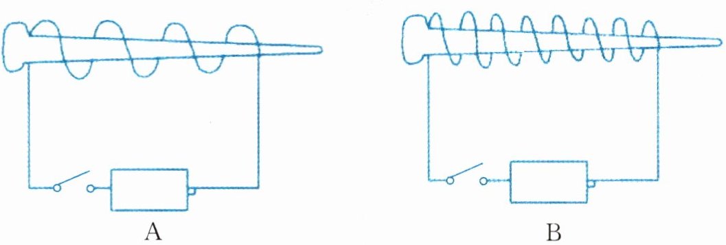 2. 实验现象:A(或B)图中的电磁铁吸引的大头针数量比B(或A)图中的多(具体根据线圈匝数多少对应,匝数多的吸引多)。