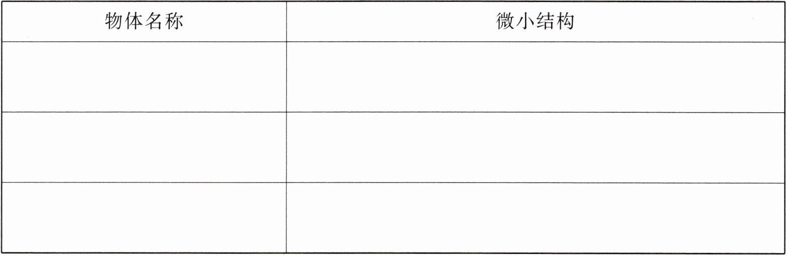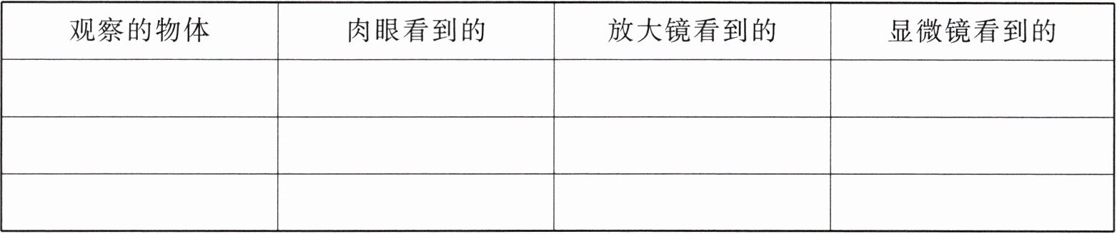 |观察的物体|肉眼看到的|放大镜看到的|显微镜看到的|