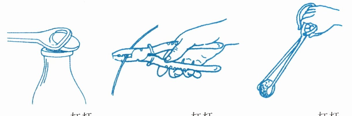 2. 请分别标出下图中这些“杠杆”的支点、用力点和阻力点(9分),并说明它们分别是哪一类型的杠杆(省力还是费力)。(6分)