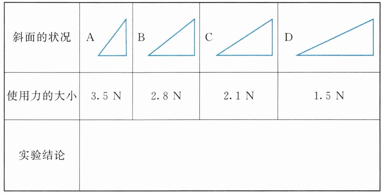 3. 下表是某小组在测定不同坡度斜面上拉同一个物体时记录的弹簧测力计读数,请你分析数据后填写实验结论。(5分)