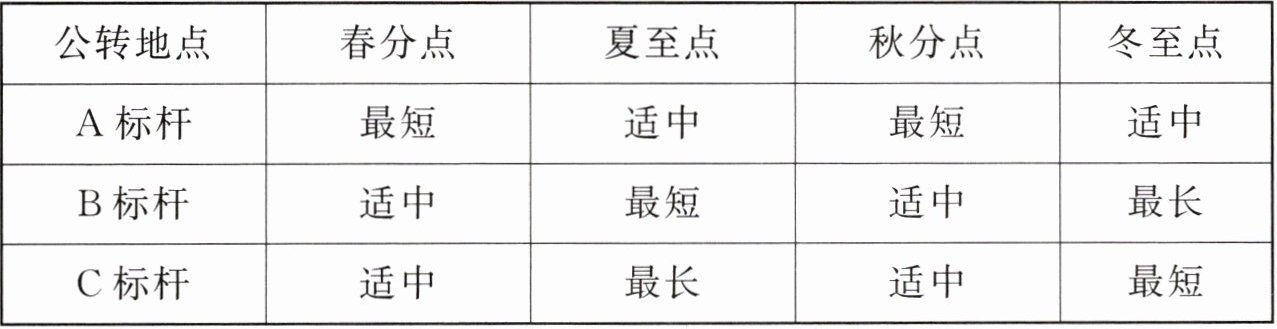 (2)春分点,B标杆处于( );C标杆处于( )。夏至点时,B标杆处于( );C标杆处于( )。