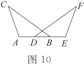 4. 如图 10,点$A$,$D$,$B$,$E$在同一条直线上,$AD = BE$,$AC = EF$. 要利用“边角边”得到$\triangle ABC \cong \triangle EDF$,还需添加的一个条件是______.