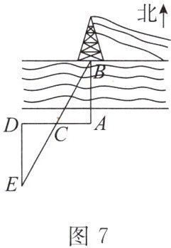2. [教材第 116 页“思考”改编]如图 7,小刚站在河边的点 $ A $ 处,在河对面(小刚的正北方向)的点 $ B $ 处有一座电线塔,他想知道电线塔离他所在的点 $ A $ 处有多远,于是他沿正西方向走 $ 20 $ 步到达一棵树 $ C $ 处,接着沿正西方向走 $ 20 $ 步到达点 $ D $ 处,然后沿正南方向,从点 $ D $ 处开始计步,当小刚看到电线塔、树与自己现处的位置 $ E $ 在一条直线上时,他恰好走了 $ 74 $ 步,并且小刚走一步大约是 $ 0.5 \, m $。由此小刚估计出在点 $ A $ 处时他与电线塔的距离,请问他的做法是否合理?若合理,则求出点 $ A $ 处与电线塔的距离;若不合理,则说明理由。