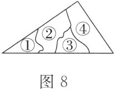 1. [教材第 119 页第 5 题改编]工人不慎将一块三角形的玻璃打碎成如图 8 的四块玻璃碎片,若想参考其中一块玻璃碎片配一块与原来大小一样的三角形玻璃,则应参考的玻璃碎片是( )。