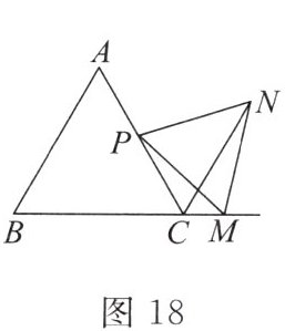 【拓展探究】(2)如图18,当点$M在BC$的延长线上时,(1)中的猜想是否依然成立?若成立,则请说明理由;若不成立,则请写出正确的猜想(不需要说明理由)。