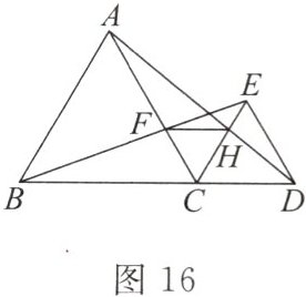 8. 如图16,点$B$,$C$,$D$在同一条直线上,$\triangle ABC和\triangle CDE$都是等边三角形,$BE交AC于点F$,$AD交CE于点H$,连接$FH$。