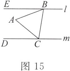 如图15,直线$l // m$,等边三角形$ABC的两个顶点B$,$C分别落在直线l$,$m$上,若$\angle ABE = 21^{\circ}$,则$\angle ACD$的度数是( )。