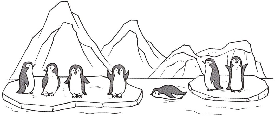 小萱一家周末到动物园参观,来到企鹅馆。她发现左边冰面上有$4$只企鹅,右边冰面上有()只企鹅,又游来了$1$只企鹅,现在一共有()只企鹅。
