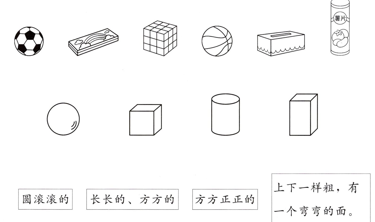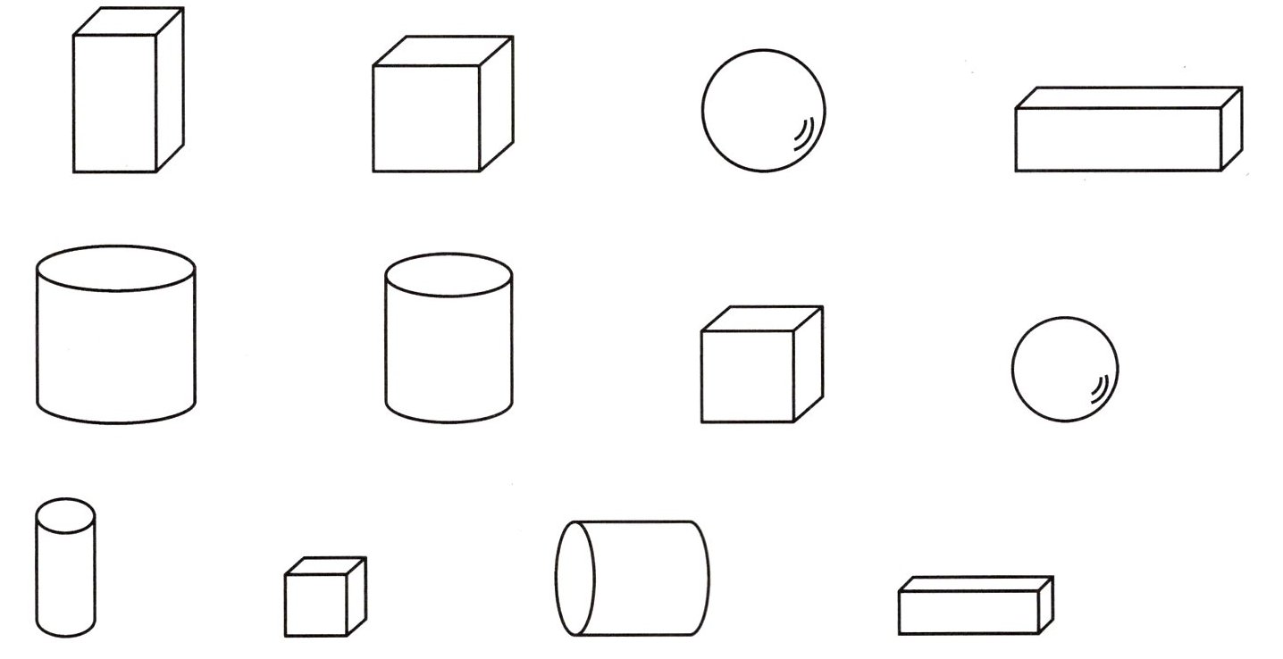 2 涂一涂。把长方体涂成黑色,把正方体涂成蓝色,把圆柱涂成绿色,把球涂成黄色。