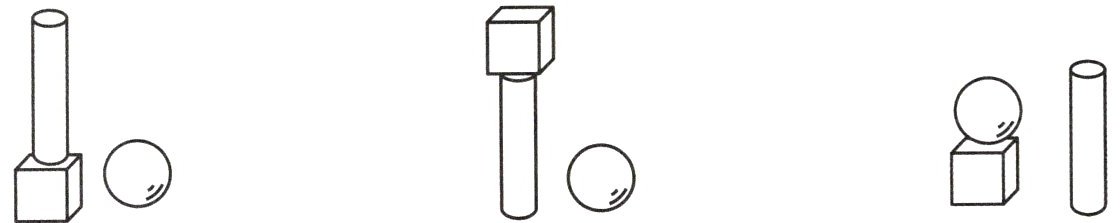 先摆一个圆柱,在圆柱的上面摆一个正方体,再在圆柱的右边摆一个球。