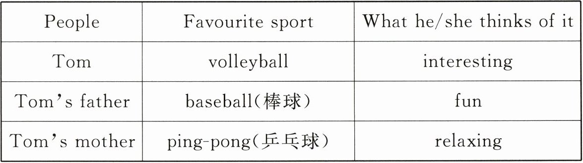 One possible version: My name is Tom. There are three people in my family: my father, my mother and I. We all love sports. I like volleyball. I think it is interesting for me. I always play it with my friends. My father loves baseball. For him, there is so much fun in baseball. He has eight baseball bats(球拍) in his room. My mother likes ping-pong because she thinks it's relaxing. She likes to watch ping-pong games on TV, too. We think playing sport is good for our health. We all love sports.