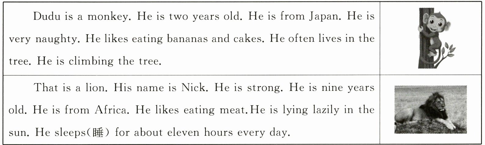 )48. What does Dudu like eating?A. Bananas and cakes. B. Grass and bananas. C. Meat and cakes.
