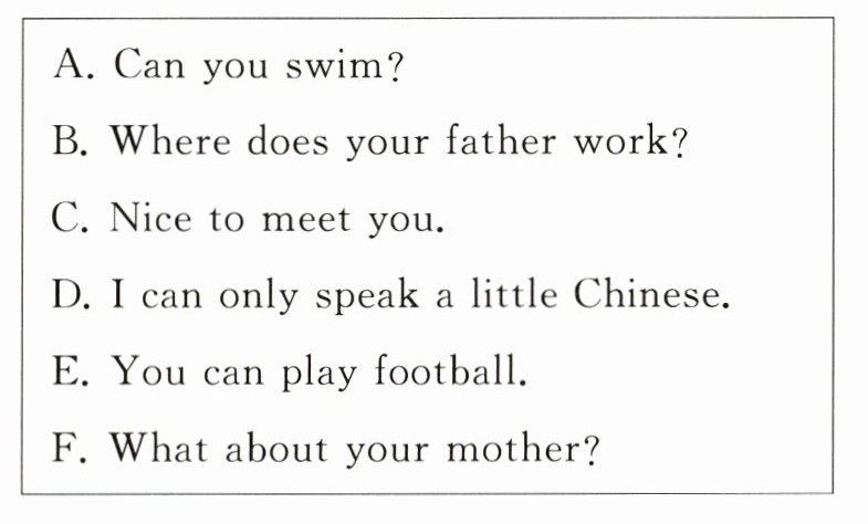 )A:Nice to meet you,too. My name is Wang Lin. Can you speak Chinese,Betty?