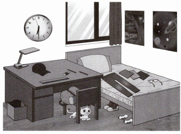 bed, desk, chair, clock, lamp, book, cap, cat, socks, shoes