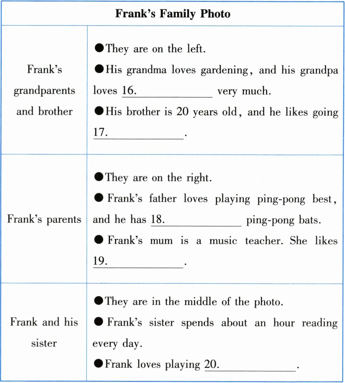 . $|| Frank and his sister |$ ●They are in the middle of the photo. ●Frank’s sister spends about an hour reading every day. ●Frank loves playing 20.