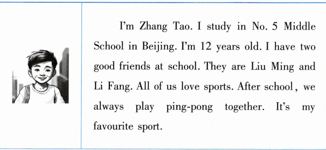 I’m Zhang Tao. I study in No. 5 Middle School in Beijing. I’m 12 years old. I have two good friends at school. They are Liu Ming and Li Fang. All of us love sports. After school, we always play ping-pong together. It’s my favourite sport.