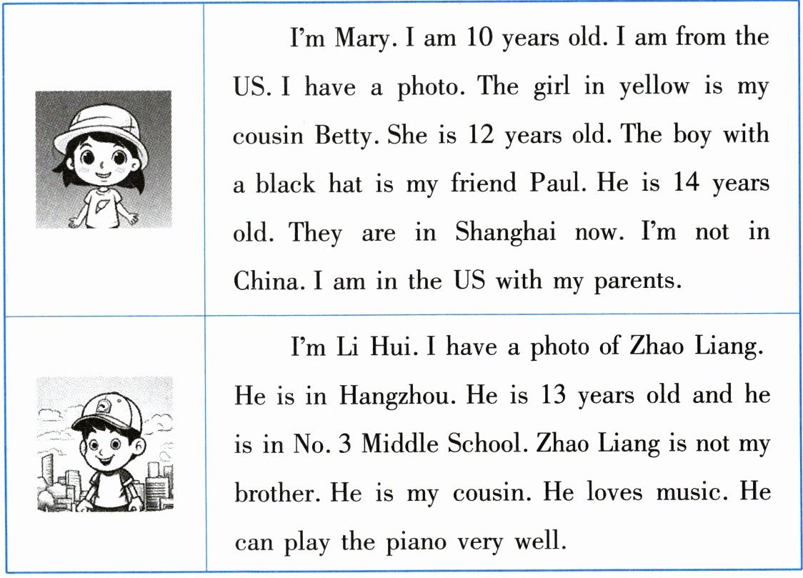 I’m Mary. I am 10 years old. I am from the US. I have a photo. The girl in yellow is my cousin Betty. She is 12 years old. The boy with a black hat is my friend Paul. He is 14 years old. They are in Shanghai now. I’m not in China. I am in the US with my parents.