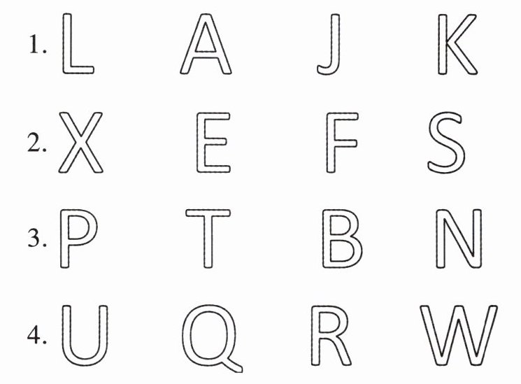三、李莉正在学习 26 个英文字母的发音,请帮她找出每行字母中元音音素与其他不同的字母,并将其涂上你喜欢的颜色。