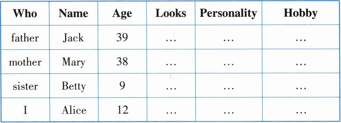 假如你是Alice,下周你们班要举办一次以“我的家庭”为主题的班会。请你根据下表所提供的信息,用英语写一篇短文,为班会做准备。
