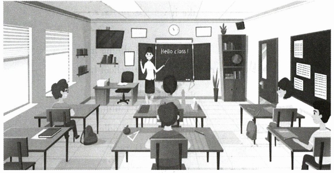 请根据下面的图片内容和提示词写五句话,描述一下教室里物品的位置。