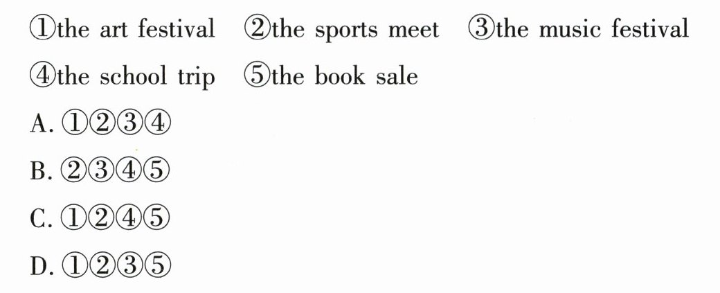 ①the art festival ②the sports meet ③the music festival ④the school trip ⑤the book sale