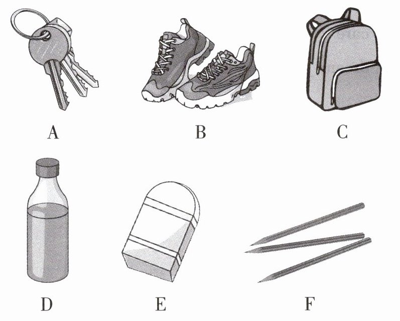 二、下列图片分别对应的是哪些物品呢?请将图片序号填写在对应英文名称前的括号内。
