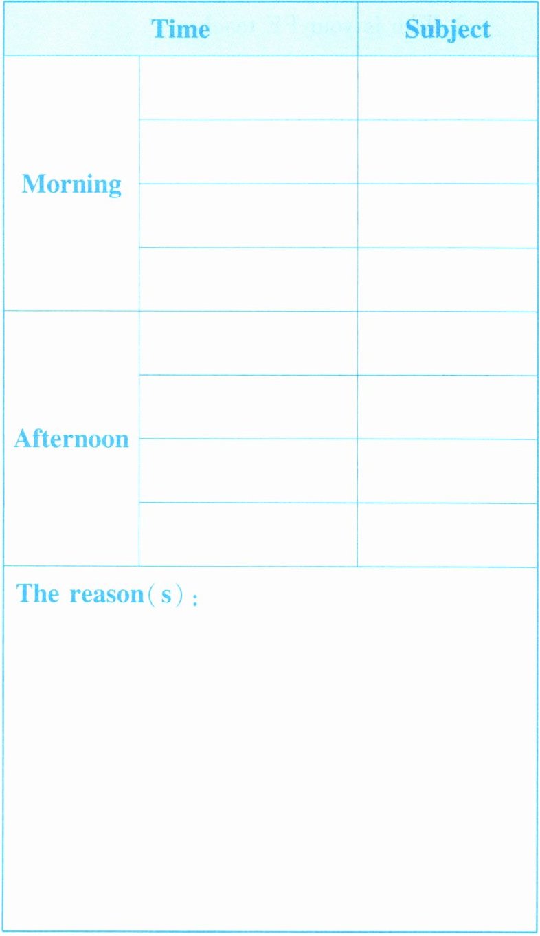 八、同学们,你们最喜欢哪一天的课程呢?请你在下面的表格中填写这一天的课程安排,并写出喜欢的原因(不少于 5 句话)。