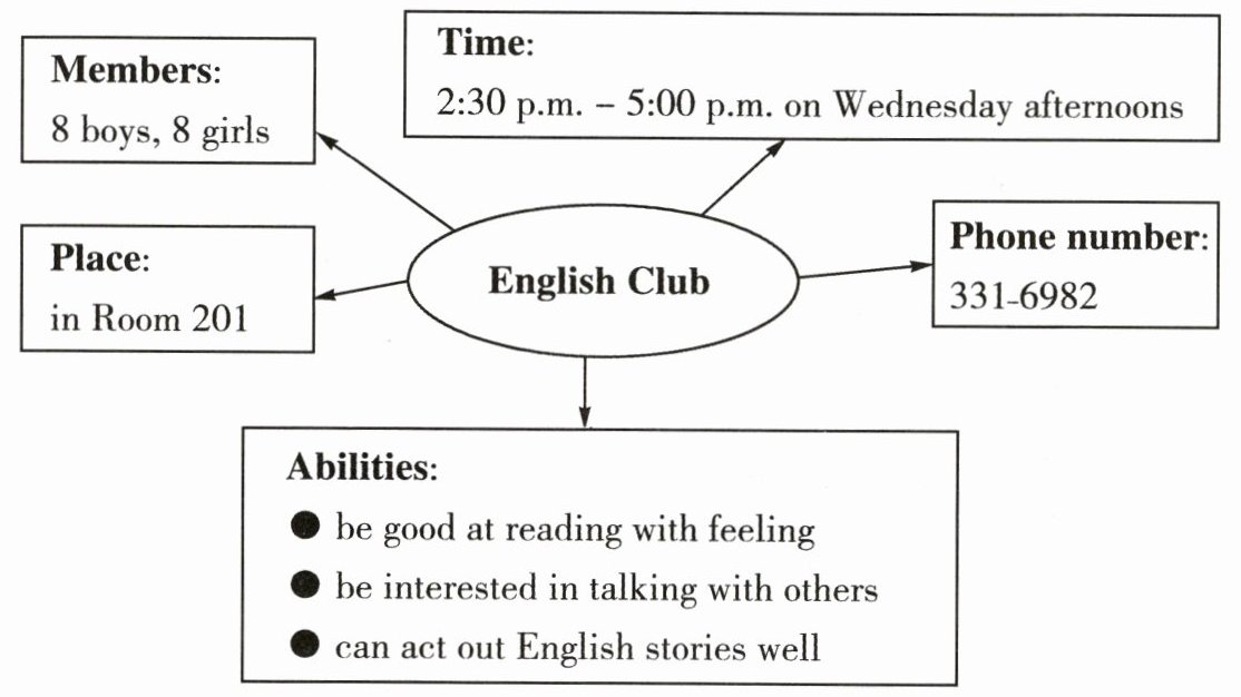 Our school plans to set up an English Club. We need 8 boys and 8 girls. You should be good at reading with feeling, interested in talking with others and able to act out English stories well. The club will be in Room 201 from 2:30 p.m. to 5:00 p.m. on Wednesday afternoons. Please call 331-6982 if you want to join.