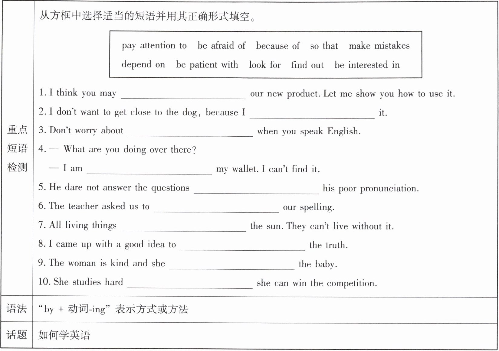 1. be interested in 2. am afraid of 3. making mistakes 4. looking for 5. because of 6. pay attention to 7. depend on 8. find out 9. is patient with 10. so that