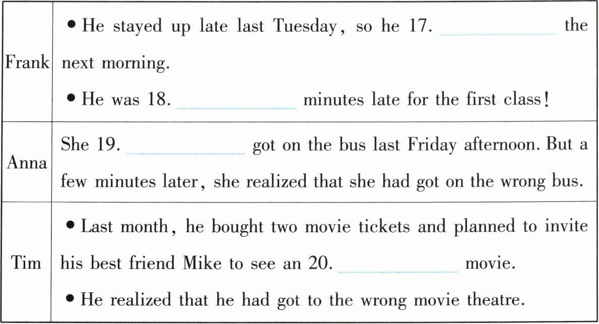 16. costume 17. overslept 18. six / 6 19. hurriedly 20. action