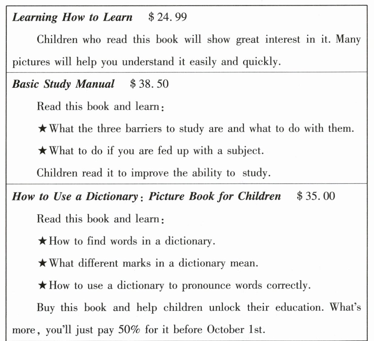 ) 25. What’s the purpose of the above information?A. To sell the three books to children.