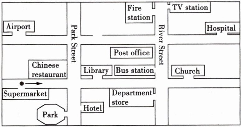七、Henry 和 Mary 在一家超市门前相遇,Henry 打算去医院看望生病的奶奶,于是向 Mary 询问去医院的路。请你根据下面的图示信息完成对话。