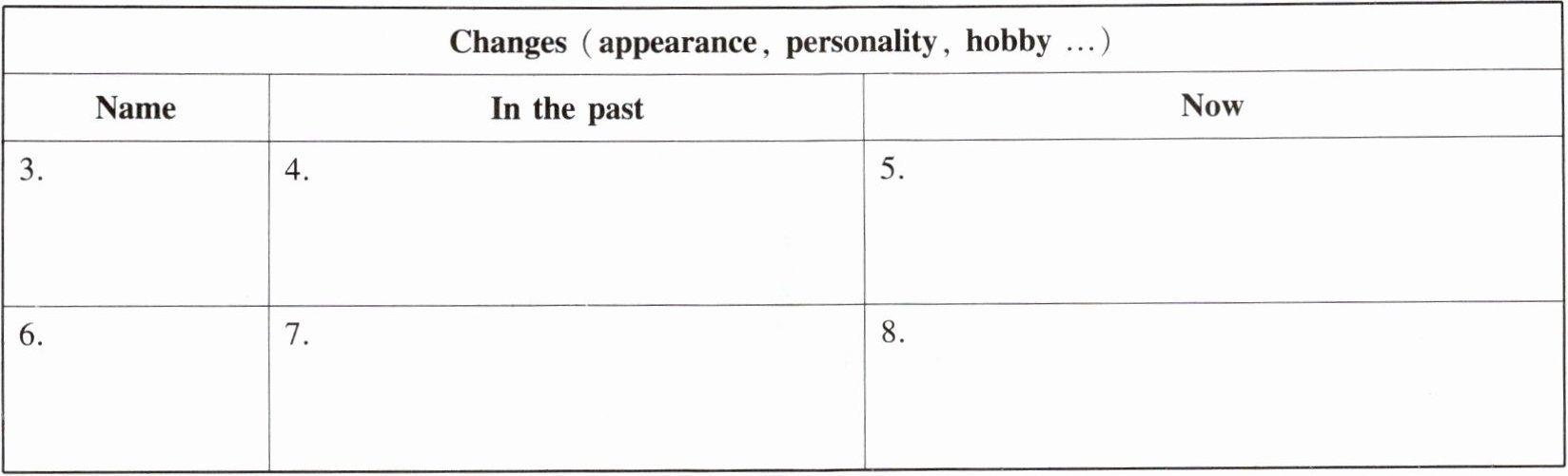 示例: 1. I used to be thin and short. I was afraid of speaking in public. 2. Now I'm strong and tall. I become brave. I love making friends with other people. 3. Sally 4. She used to be quiet and shy. She used to play ping-pong on weekends with her friends. 5. Now she is active and outgoing. She takes up dancing as her hobby. 6. Frank 7. He used to be heavy and wear glasses. He used to read books after class and hardly play sports. 8. Now he is thin and tall. He loves playing all kinds of sports, such as tennis, basketball and volleyball.