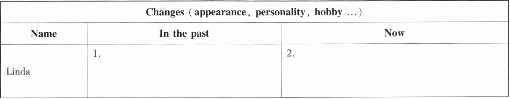 七、同学们,在这三年的初中生活里,你们每个人身上一定都发生了很大的变化吧?假如你是Linda,请写下你的成长变化信息,并采访你的两位同学,写下他/她们的变化。