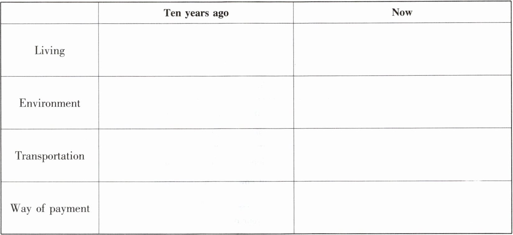 七、随着科技的发展,近年来我们国家发生了巨大的变化,人们的生活更加便捷、舒适和美好。请你根据下面的提示信息,用英语完成表格,写一写中国发生的变化。
