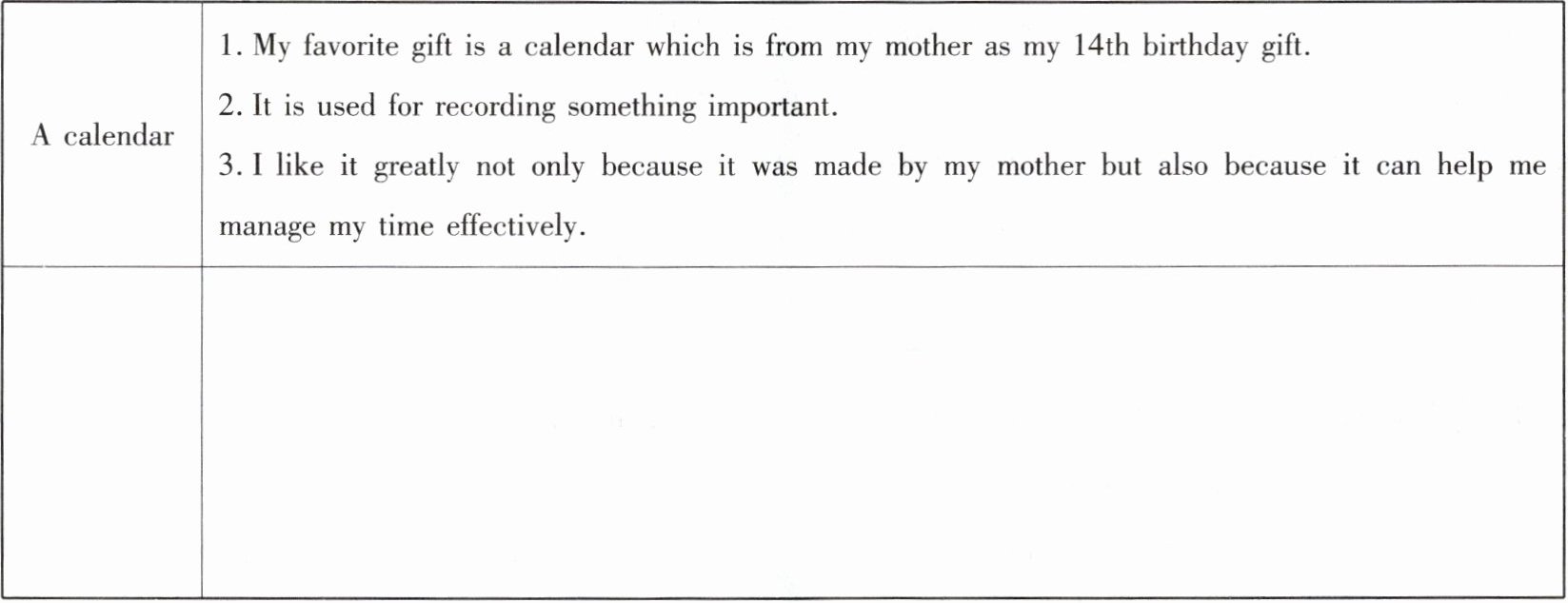 六、每年过生日的时候你一定会收到很多礼物吧?你最喜欢的生日礼物是什么?请你仿照表格中的例子,描述一个你最喜欢的生日礼物、它的主要功能及你喜欢它的原因。